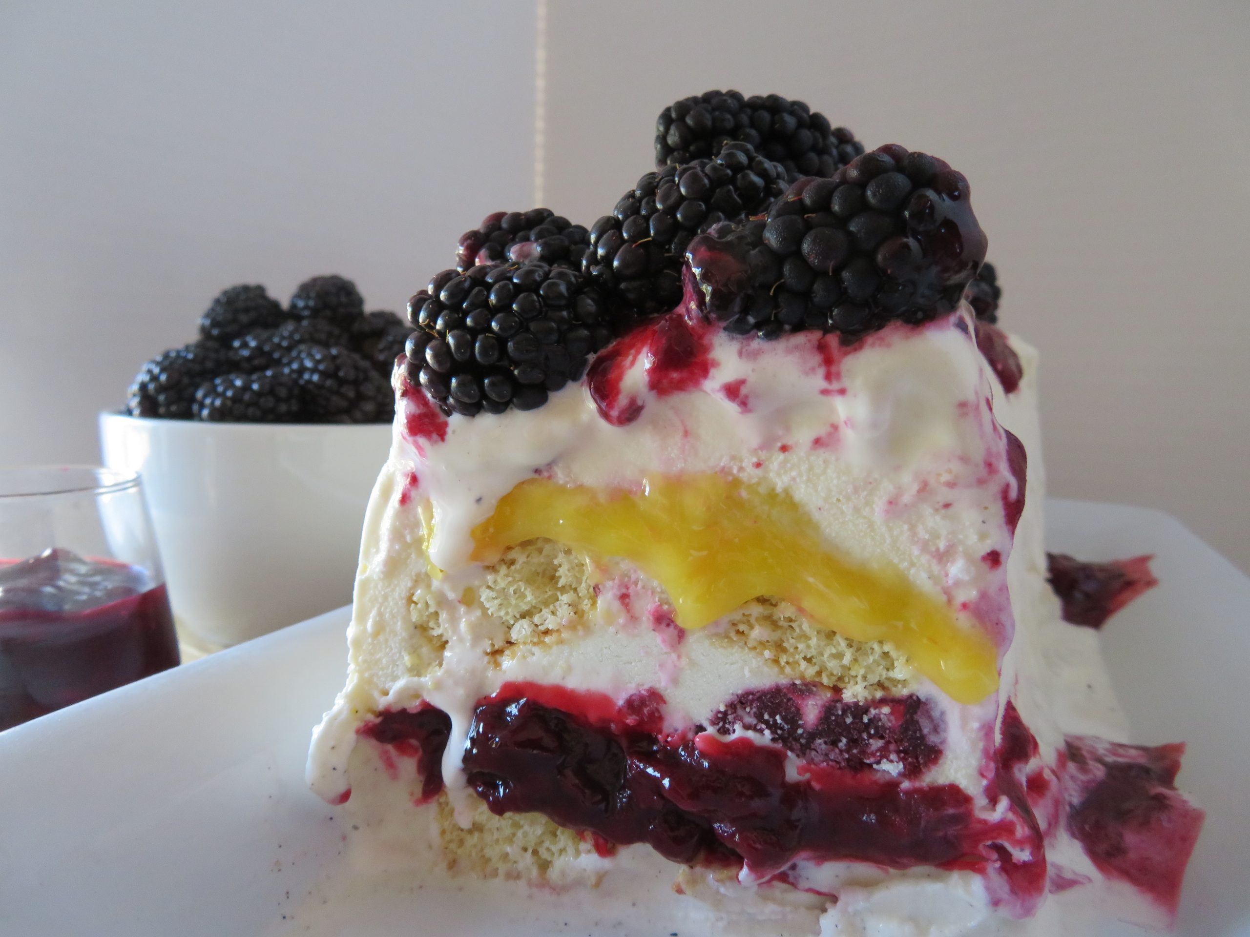 - Begin by layering the softened ice cream into the bottom and up the sides of the pan, creating a half-inch layer. Then, layer ladyfingers, followed by a layer of blackberry sauce, another layer of ice cream, a layer of ladyfingers, a layer of lemon curd, and another layer of ice cream. Cover the top with plastic wrap and freeze.